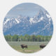 BuffaloWorks Photography presents bison at the Grand Tetons through the lens. This photo of a pair of buffalo shows them grazing in front of the Tetons mountain range. The sticker with this scenic is one of many products that you can find with this teton buffalo photo on it. From apparel to tote bags, as a gift or for yourself, BuffaloWorks Photography has our world for you to enjoy. The nature, wildlife and other photos that we have available can be seen at www.buffaloworks.us .