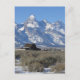 A beautiful photograph of the old historic Moulton barn at the base of the majestic Teton Mountains, a bright blue sky shining on the winter landscape.