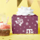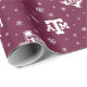 A spirited holiday pattern featuring Texas A&M University symbols, including the "Gig 'Em" thumbs up, maroon helmet, Reveille the mascot, and Texas state outline with the "ATM" logo. Maroon snowflakes are scattered throughout, adding a festive touch to this Aggie-themed winter design, perfect for fans of Texas A&M.