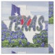 Texas state outline with Texas flag and Texas letters cutout in bluebonnets on a background of bluebonnets and blue sky printed on fabric. This design is also available in 9" squares