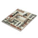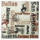 This tile features the names of several Texas cities, including Dallas, San Antonio, Abilene, College Station, Waco, Galveston, Houston, Austin, Corpus Christi, and more. In addition, there are images of spurs and bucking broncos to give it a definite western feel. The image is in brown, black, tan, and off-white. Unique!