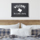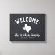 Modern farmhouse wall art welcome sign personalized with your family name and city or other custom text on a faux chalkboard background. Click Customize It to move the heart to any location on the state map and further personalize the text. Custom name signs make a perfect housewarming or wedding gift for couples and families!