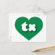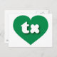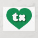 This postcard features a vibrant green heart containing the bold, white, rounded lower case letters tx, a playful abbreviation for Texas, the lone star state. The reverse side of the card is blank, awaiting your personalized text or handwritten sentiments.