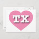 This postcard features a calm, cool pink heart containing the bold, white, upper case letters TX, the official abbreviation for Texas, the lone star state. The reverse side of the postcard is blank, awaiting your personalized text or handwritten sentiments.