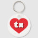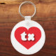 This key chain features a vibrant red heart containing the bold, white, rounded lower case letters tx, a playful abbreviation for Texas, the lone star state.