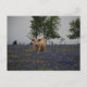 Longhorn in field of Texas state flower the bluebonnet.