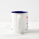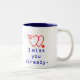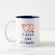 This is a blue, red and white ringer mug featuring the popular text 'I miss you already'. A great gift mug for someone you care about. The text is easily personalized to say anything you like easily. It also features two red hearts bound together with an arrow through it.