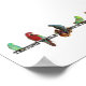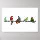 Two parrotlets, a macaw, a lineolated parakeet and a cherry headed conure sit on letters that spell, "Texting while driving is for the birds" on this thoughtful poster