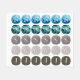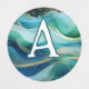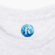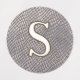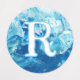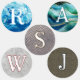 Round, custom clothing labels for kids. Texture designs in monochrome colors that work well for boys. Each of five rows of labels will hold a different initial if needed, or customize as needed. Blue paint, teal green waves, snakeskin, gray stone, and brown mesh are the backgrounds. Each initial is white with a colored outline.