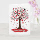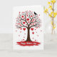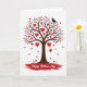 Designed with a striking tree scene set against a wide white background, this card centers on a sturdy trunk in deep earthy brown that branches upward with many fine limbs. Instead of leaves, the branches carry a shower of red heart shapes, some hanging like little ornaments and others drifting outward as if caught in a soft breeze ❤️. Near the top, a small black bird silhouette rests on one branch, adding a quiet, gentle pause that feels like a tender moment in the middle of all that affection. The strong contrast between the dark trunk, the bright hearts, and the open white space keeps the scene airy and easy to take in. Along the bottom, a wide red brushstroke runs horizontally and grounds the picture like a painted ribbon. Centered on that red band is a short greeting in white lettering, with the text sitting neatly across the stroke for clear reading 🌼. The final detail is the scatter of different-sized red hearts spreading from the branches into the surrounding white space.