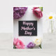This card features a rectangular black card centered on a softly textured white background, surrounded by fresh flowers that lean in like a gentle hug ❤️. Across the middle of the black card, the words “Happy Mother’s Day” appear in soft pink lettering, standing out clearly against the dark surface. In the top left, a small cluster of lavender, multi-petaled blooms spreads outward, adding a light, airy touch. The top right holds a full fuchsia-pink flower with tightly layered petals, curling inward like a tender secret shared between close friends. At the bottom left, a blush pink rose opens in a classic spiral, while the bottom right pairs a deep purple bloom with a creamy white rose that’s just starting to reveal its center 🌼. Soft, diffused light smooths the shadows and brings out the velvety petals and the subtle grain of the background. The flowers frame the card on all four sides, with the brightest fuchsia bloom anchored at the upper right edge.