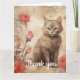 A fluffy tabby kitten with striking blue eyes is sitting next to two pink roses against a backdrop featuring vintage script and ink blotches. The sepia tones give a warm antique feel to the composition, which combines florals and a cute animal subject.