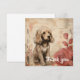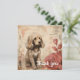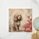 A golden brown puppy with fluffy fur is sitting quaintly next to a couple of large, stylized roses. The background features abstract beige tones with subtle floral outlines and script-like markings, giving a soft, vintage feel to the whole composition.