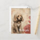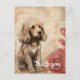 A golden brown puppy with fluffy fur is sitting quaintly next to a couple of large, stylized roses. The background features abstract beige tones with subtle floral outlines and script-like markings, giving a soft, vintage feel to the whole composition.
