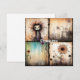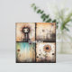 A whimsical character with wild hair and big eyes occupies the top left square, hinting at a Tim Burton-esque aesthetic. The top right square features gothic architecture with a desolate, possibly post-apocalyptic vibe, while the bottom squares display stylized, vibrant flowers against an ethereal backdrop.