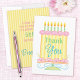 Pink icing flowers and green candles top tall yellow striped birthday cake to help your 5 year old express appreciation for the celebration.