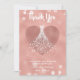 Modern bridal shower thank you card with a trendy rose gold pink color scheme- Reads 'Thank You' at the top in modern lettering. Centered is a girly, faux foil rose gold heart with faux diamond gemstones, elegant wedding gown overlaid on top. Message of appreciation below in simple, white lettering. Personalized with future bride's name at the bottom in matching lettering style. Popular, faux rose gold foil background with large white, translucent champagne bubbles scattered at top and bottom. Back has matching faux rose gold foil with white dots border at top and bottom. Elegant bridal shower thank yous ready to be personalized. We have coordinating rose gold bridal shower invites and bridal shower postage stamps in our Zazzle.com/angela65* shop.