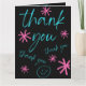 Say "thank you" for any occasion with this decorative black, bright blue and pink-colored folded card with pink stars and a smiley face.