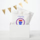A fun and colorful 8th birthday party favor bag ready for your customized text. The circular design features a large red birthday banner with the message "HAPPY BIRTHDAY". Underneath, is a blue and red sports top, with a large white number 8 and space for the birthday child's name. Additional editable text in blue, top and bottom on the bag, reads "THANK YOU" "for coming to my party".