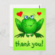 A cute green cartoon frog with red hearts, big googly blue eyes, for a heartfelt expression of thanks! You can change the "thank you" text to any brief message you like, such as - i miss you, i love you, call me, be hoppy!