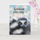 Cute Thank You, paper greeting card with a photo of a ring tailed lemur wrapped up in its tail. Wildlife themed greeting card. Lemur just say ... or Let me just say... pun written on the cover. Customize the interior message as desired. Art, image, and verse copyright © Shoaff Ballanger Studios, 2024.