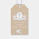 Add a personal touch to your party guests favors with this gift tag. It has a light brown textured background. There's a banner that reads "My First Communion" with doves on each side holding it with a light blue cross in the center of a white circle. Personalize with name. You can customize the font style, color, and style.