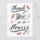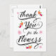 Thank those who have sent flowers to the funeral of a loved one with this unique calligraphy style card featuring the message in black letters, "Thank you for the flowers", on white background with colorful floral accents.