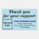 Customizable sticker with message Thank you for your support. Sticker to appreciate the support of your customers or clients. You can also use it as marketing material to advertise your business and to promote your brand name or build brand name awareness. Designs are dark blue and black texts on light blue background and rectangle shape. To customize this sticker, upload your business logo, type your business or company name, address and phone number. After uploading logo and typing texts, please check the appearance. If the appearance is pleasing to you, you can place your order now. If you need to resize and move the logo and texts to fit on this sticker, please change in the design tool. You can also make other changes according to the appearance that you prefer in the design tool such as changing the background color, font color and font style.