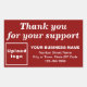 Customizable sticker with message Thank you for your support. Sticker to appreciate the support of your customers or clients. You can also use it as marketing material to advertise your business and to promote your brand name or build brand name awareness. Designs are white texts on red background and rectangle shape. To customize this sticker, upload your business logo, type your business or company name, address and phone number. After uploading logo and typing texts, please check the appearance. If the appearance is pleasing to you, you can place your order now. If you need to resize and move the logo and texts to fit on this sticker, please change in the design tool. You can also make other changes according to the appearance that you prefer in the design tool such as changing the background color, font color and font style.