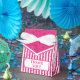 The background is a simple stripes pattern with fuchsia and white vertical stripes and confetti for an all-over geometric print. The design is suitable for all occasions, all ages, and all genders.