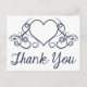 This sweet postcard features a navy blue heart surrounded by swirls with a thank you greeting in a cute handwritten font highlighted against a creamy white background. The back of the postcard is blank for your message.