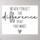 "Never Forget the Difference You Make" is a powerful reminder of the impact we can have on the world around us. It encourages us to recognize the positive influence our actions, words, and presence can have on others. Whether it's a small gesture of kindness or a significant contribution to a cause, every individual has the potential to make a difference.