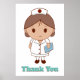 Cute nurse with a white uniform and hat and brown hair, she is holding a blue medical file. Below in blue lettering are the words Thank You.