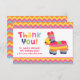 Thank you guests for making the birthday party a fun and colourful one with this fiesta themed thank you card! Design includes a donkey pinata in multiple stripes of colours and the words "Thank You!" in matching colour palette. The background is a colourful and cheerful chevron pattern. Personalise easily with your thank you message.