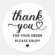 Add a charming handmade touch to every package with this white classic round sticker featuring "Thank You" in romantic script calligraphy with a sweet heart flourish, plus "For Your Order, Please Enjoy" beneath. Perfect for online shop order inserts, ecommerce packaging, etsy seller shipments, handmade shop seals, and small business customer thanks.