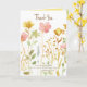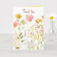 Thank you greetings featuring a scripture from the Bible 1 Thessalonians 5:18 and decorated with pastel wildflowers in shades of pink, olive, and golden brown watercolor. On the inside is a soft shade of yellow and text that you can edit to fit your needs.