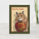 A sweet hamster with cute beady eyes is clutching a bright red apple. His shadow is cast onto an rectangular shape that is a soft beige color and a green border surrounds that. The words say "Thank You Teacher". Words on the inside are customizable.