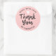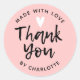 A personalized blush pink 3 inch "made with love, thank you" sticker on a pink colored background. Make it yours by adding your own name. A pretty finishing touch for all of your handmade and homemade gifts. Comes in a 1 1/2 inch size as well. Perfect to thank customers in your homemade crafting business. Designed for you by Blackberry Boulevard.