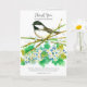 A thank you card for volunteers featuring a scripture from the Bible book of 1 Thessalonians 1:2 KJV and decorated with a chickadee bird on a branch of catkins over a bouquet of mayflowers illustrated with watercolor. On the inside is a soft shade of grey with text that you can edit to fit your needs. Thoughtful greetings for church or ministry volunteers.