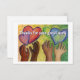 Card message notes "Thanks for your great work". Multi-racial hands reach for colorful rainbow hearts as a celebration of DEI or diversity, equity, and inclusion. Art was made using watercolor followed by pastel on paper.