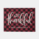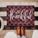 Personalized welcome mat in rustic red and black buffalo plaid features "thankful" in hand lettered calligraphy script, accented with a sprig of autumn leaves. Personalize with your names or family name along the bottom for a perfect way to add autumn cheer to your doorstep this Thanksgiving season.