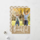 Festive Thanksgiving photo card features your favorite fall photo with a bottom border of rustic tan kraft. "Thankful" is overlaid in white hand lettered script, with your names and the year beneath.