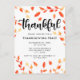 Elegant and modern style Thanksgiving party invitation postcard with text that says "Thankful" in hand lettering and calligraphy style font. Features watercolor style fall leaves foliage.