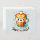 Express your gratitude with this charming card featuring a cute latte character and the playful message "Thanks a Latte!" Perfect for sending a heartfelt thank you to someone special. This adorable card adds a touch of whimsy and warmth to your message of appreciation.