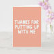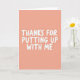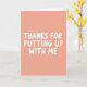 This greeting card features a soft peach background with a centered message in rounded white sans-serif letters that feels like a gentle nudge between close friends or partners ❤️. The words “THANKS FOR PUTTING UP WITH ME” sit right in the middle, evenly spaced, and sized large enough to be the main focus. The letterforms look slightly puffy, as if they’re softly raised from the surface, adding a tender, affectionate tone without any extra imagery. With no characters or scenery, the empty space around the text reads like a quiet pause after a shared joke or a long day together. The warm peach and crisp white pairing keeps everything calm and intimate, like a cozy note left on the counter. The phrase is direct but softened by the rounded shapes, giving it a sweet, self-aware feel that suits romance or friendship 🌼. The centered white text stands out clearly against the uniform peach field, with no borders, icons, or additional decoration.