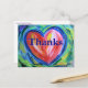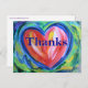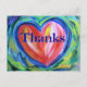 The postcard message notes, "Thanks." The painting features a colorful red heart with glimmers of white and gold accents. The heart is outlined in blue and has a soft green background. This heart painting is a tribute to holding hope within your heart when the sad blues surround you but pushing through for green renewal.