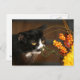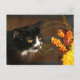 Black and white kitty cat sniffs at the Thanksgiving decorations photo postcard