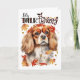 A pretty little Cavalier King Charles cocker spaniel dog has autumn leaves floating down around it on this fun Thanksgiving greeting for dog lovers.