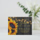 Modern rustic elegant Thanksgiving family holidays moving announcement postcard featuring a beautiful yellow orange sunflowers bouquet and a gold chic typography script over a rustic country dark brown barn wood background with string lights.