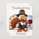 This is a Thanksgiving turkey raising a glass of wine in a toast. A funny cute card to use as an invitation to your home or to send as a "thinking of you at Thanksgiving" The turkey is in the pilgrim clothes with glass raised high.